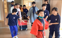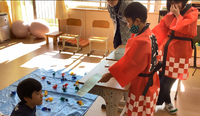 中学部生徒から霊山太鼓を披露してもらったり、地域の祭りの動画を見たりして、まずはイメージを膨らませました。そして出店や御神輿を自分たちで作り、お祭りの準備を進めました。お祭りの中では、魚つりゲームやクレープ屋さんの出店でお客さんに楽しんでもらいます。お祭りのクライマックスでは、御神輿を引いて校内を練り歩きます。「わっしょい」の元気な声を響かせると、他の教室からも児童や先生が出てきて、一緒に参加してくれました。