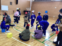 節分の歌と手遊びで季節を感じたり、新聞紙を丸めて作った「豆」で豆まき遊びをしたりしていると。。。教室に鬼が入ってきて、児童はビックリです。最初は逃げている児童もいましたが、最後は「豆」をぶつけて鬼退治に成功しました。