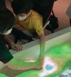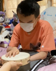 「触れよう・作ろう」の学習では、色や形、感触等を感じながら、友達が育てた大根やさつまいもに触れたり、シールやスタンプ、ローラー等を使って作品を描いたりしました。「歌おう・鳴らそう」の学習では、様々な楽器を鳴らして音やリズムを感じたり、友達が歌う動画を鑑賞したりしました。それぞれ、好きな活動や季節を知る活動等に、教師と一緒に取り組んでいます。