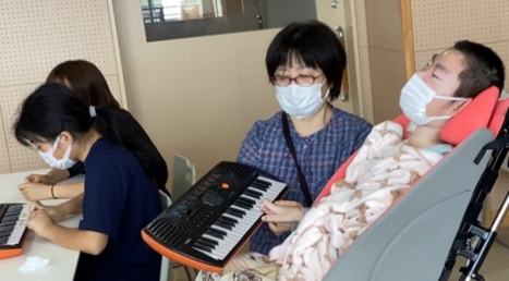 登校したり、校外に出かけたりして、集団での学習や行事に取り組んでいます。今年度は、「音楽」の学習で楽器演奏をしたり、友達と身体表現を楽しんだりして、にぎやかな雰囲気を味わいました。また、「コミュタン福島」で風力発電を体験したり、学校祭「だてっこみらいフェスティバル」でステージ発表に参加したりしました。その他、二人とも、ビデオレター等を活用して、大好きな友達と交流しています。